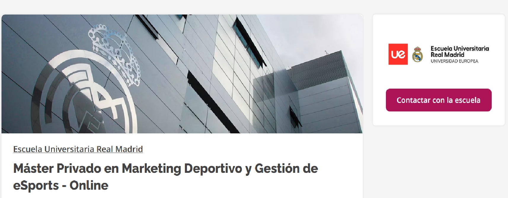 | Máster en Marketing Deportivo y Gestión de Esports (Escuela Universitaria Real Madrid) | Presencial (Madrid) | 9 meses | Esports, análisis de datos, tecnología, gestión digital | Semana Blanca con profesionales, red de contactos | Título Escuela Universitaria Real Madrid |