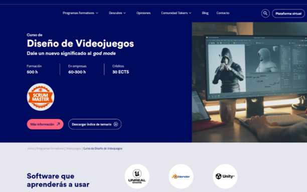La escuela de formación en tecnología Tokio School es la opción ideal para quienes desean aprender con garantías a desarrollar, diseñar, programar y guionizar sus propios videojuegos, desde cero hasta nivel experto. Cuenta con un amplio catálogo de cursos en esta área, todos ellos impartidos por profes con experiencia, recursos avanzados y prácticas en empresas:
