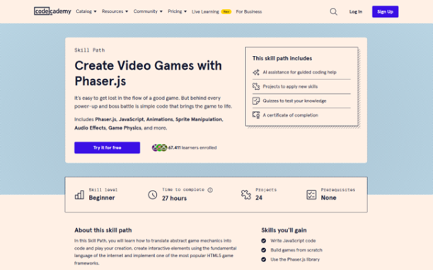 Por último, quienes buscan una opción de enfoque práctico, breve y con un programa completo y bien consensado, encontrarán en el curso de Codeacademy la formación perfecta. Este curso práctico enseña a crear videojuegos 2D con JavaScript y el framework Phaser.js, que es idóneo para desarrolladores web o principiantes.