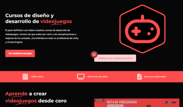 Otra de las opciones más completas en español es la ruta de formaciones de videojuegos ofrecida por Frogames. En este caso, el programa abarca diferentes formaciones, repartidas en unas 20 horas lectivas por semana, con más de 500 horas de vídeo y más de 2.200 clases, a completar en aproximadamente 52 semanas.