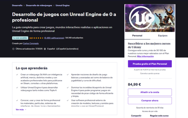 Uno de los cursos más populares en español para aprender Unreal Engine desde lo más básico es el curso ofrecido por Udemy, con más de 5.000 reseñas positivas y 54.000 estudiantes que ya han completado la formación. Es muy útil para aprender a trabajar con Blueprints, programar la lógica de los juegos y dar los primeros pasos con inteligencia artificial.