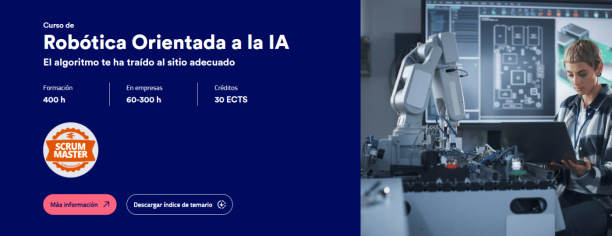 Durante el curso de Robótica orientada a la IA trabajarás con Python, sensores, visión artificial y algoritmos de control. Todo orientado a que apliques lo aprendido en tu proyecto final, con la opción de realizar hasta 300 horas de prácticas reales en empresa.