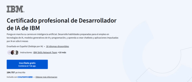 - Certificación: sí, Profesional Certificate de IBM + insignia digital